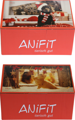 Anifit hat das passende Weihnachtsangebot für Ihren Hund bzw. Ihre Katze: Eine attraktive Geschenkbox mit acht verschiedenen Leckerlis.