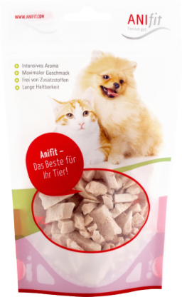 Durch die klein geschnittenen Stücke ist die Hühnerbrust vor allem für Katzen und kleine Hunde als Leckerli geeignet.
